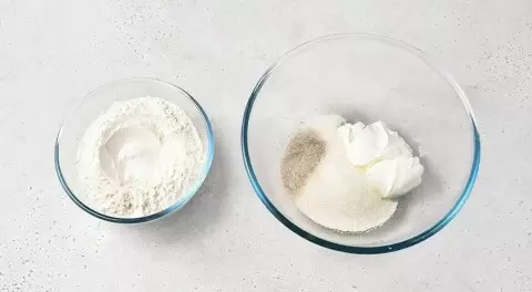 В глубокой посуде смешиваются сахар и сметана. В другой контейнер просеивается мука с добавлением разрыхлителя и соли. Сухие ингредиенты аккуратно вводятся в сметанную массу, и все соединяется, пока не образуется однородное тесто.