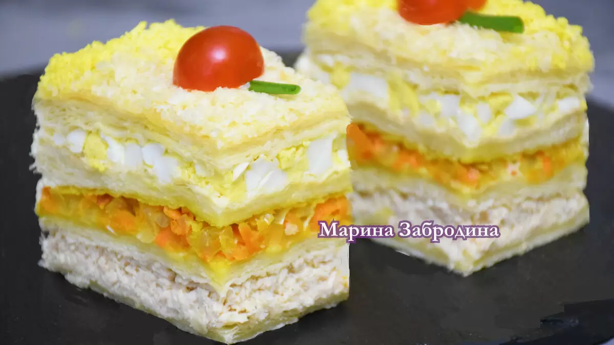 Такой закусочный торт "Наполеон" порадует всех гостей на празднике и отлично впишется в любое торжество, освежая скучные обычные сеты необычным сочетанием текстур и вкусов.