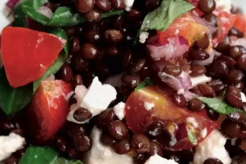 3. Добавить в чечевицу нарезанный зеленый лук, помидоры, а также немного свежего базилика и петрушки. Полить всё лимонным соком и оливковым маслом. Раскрошить фету и аккуратно перемешать все ингредиенты. Приправить солью и перцем по вкусу. Салат лучше всего подавать при комнатной температуре.