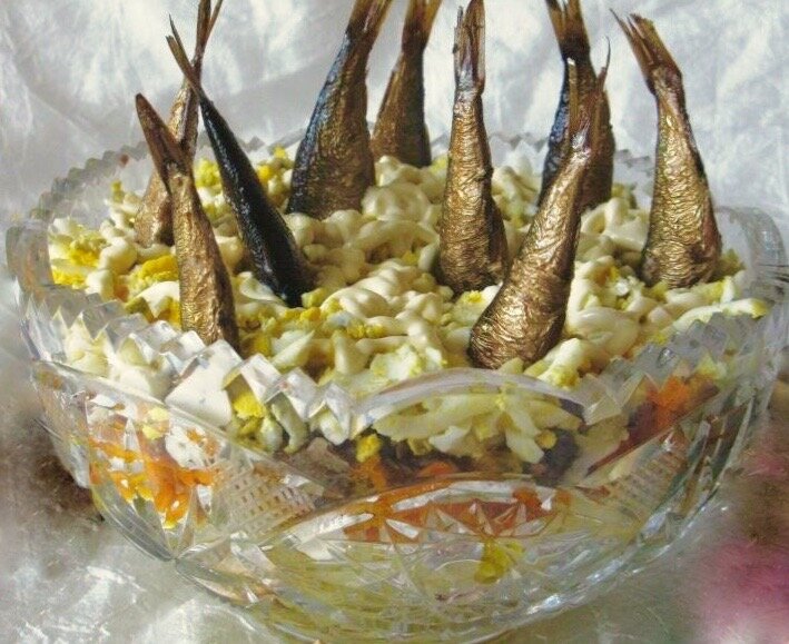 Рецепт этого салата считается классикой и действительно насчитывает почти 50 лет. Первые ГОСТовские шпроты появились на свет в 1955 году, и именно из них когда-то делали этот салат. Сегодня это блюдо становится все более доступным, а его оформление в виде шпротин, воткнутых в салат, стало настоящей кулинарной нарядностью.
