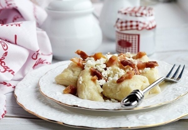 В то время как клецки варятся, бекон нарезают кубиками и выкладывают на сковороду. Его жарят до золотистой корочки, а затем на этом же жиру обжаривают мелко нарезанный лук до хрустящей текстуры. Готовые клецки выкладывают на тарелки, щедро посыпают жареным луком и шкварками, поливают горячим жиром и посыпают крошеной брынзой. Для завершения блюда добавляют немного свежего укропа.